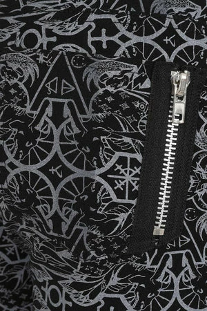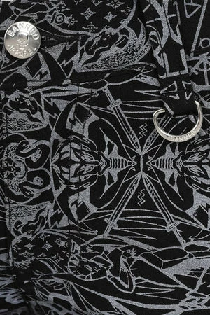 These low waist trousers have gothic themed design, front pockets, back zip pockets, belt loops detailing, a figure accentuating shape, d-ring details and it fastens with a zipper at the front.