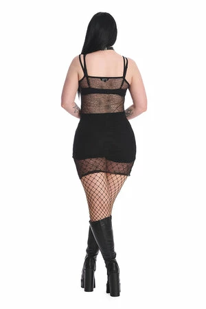 The mini gothic dress has a round neckline, lace spider embroidery, lace mesh detail and a figure accentuating shape.