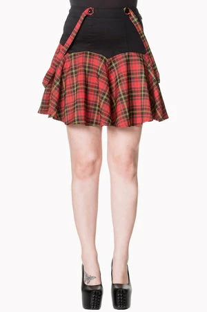 The mini skirt has tartan themed design, detachable strap detailing, a waist accentuating shape and it fastens with a zipper at the front.