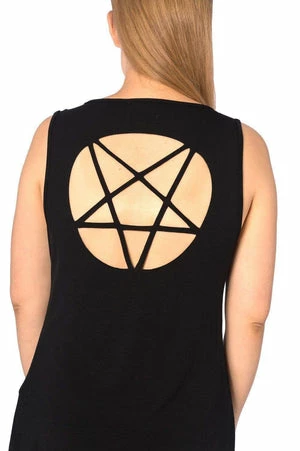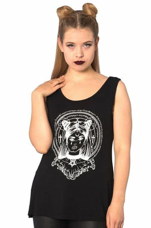 This is a striking Gothic top made by Banned Apparel, the ”Mystic Chic Pentagram top”, with girl, teardrop and mystical themed print. The knitted top is sleeveless and has a round neckline.