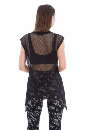 The dark top has net detailing, a crew neckline, short sleeves and a figure accentuating fit.