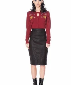 The shiny denim, pencil skirt has a figure accentuating shape and it fastens at the back with a zipper.