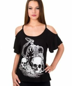 Know your time is up in this “Skull Watch” t-shirt from Banned. Made from 95% viscose and 5% elastane with a skull and pocketwatch print on the front, cut outs at the shoulders and a lace back.
