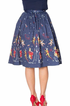 The 50s cotton satin skirt has vintage sci-fi inspired in house border print, pleats detailing, a figure accentuating shape and it fastens at the front with buttons.