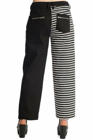 These low waist trousers have half striped themed design, front zip pockets, back zip pockets, belt loops detailing, a figure accentuating shape, d-ring details and it fastens with a zipper at the front.