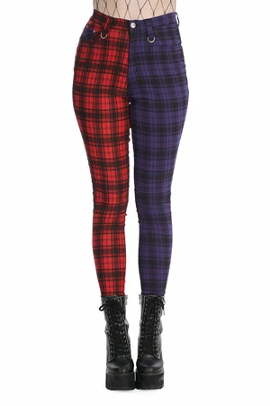 These low waist trousers have tartan themed design, front pockets, back pockets, belt loops detailing, a figure accentuating shape, d-ring details and it fastens with a zipper at the front.