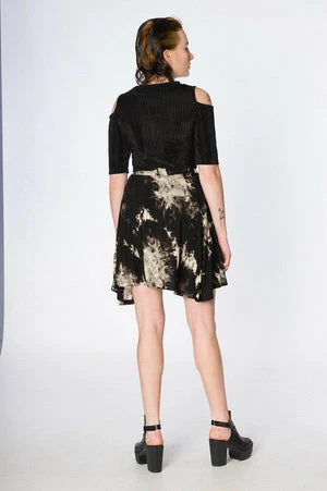 The asymmetrical dark skirt has dye themed print and a flattering fit.