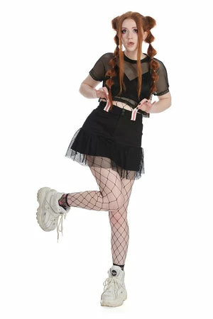 The mini skirt has mesh detailing, rabbit ears detailing and it fastens with a zipper at the front.