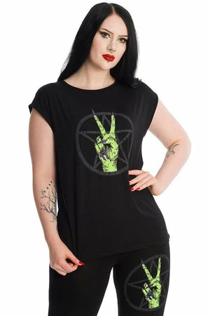 The dark top has Zombie Hand print, a round neckline, short sleeves and a relaxed fit.