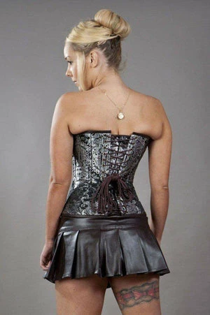 This C-Lock steampunk overbust corset in king brocade has brass studs, matte vinyl panels, brass c-lock fastening and back lace fastening with modesty panel.