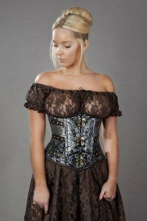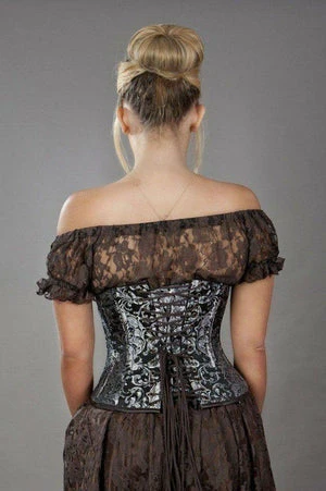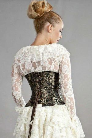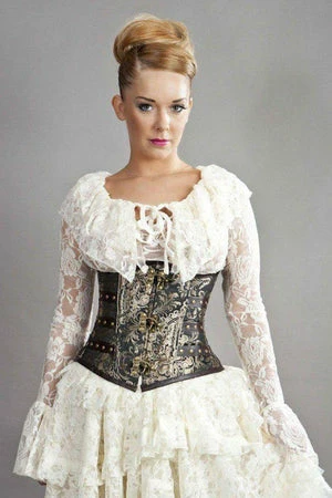 This C-Lock underbust steampunk corset in king brocade has brass studs, brown matte vinyl panels, brass c-lock fastening and back lace fastening with modesty panel.