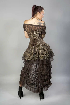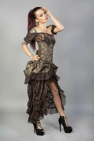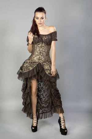 This Candy underbust burlesque, brown and gold scroll brocade corset has a waist training corset with brass c-lock fastening, laces and modesty panel at the back.