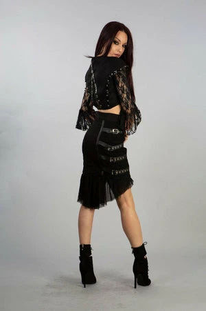 This Cecillia knee length punk rock black twill skirt has black fishnet panels, fake leather silver details buckles and a flattering fit.
