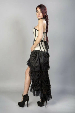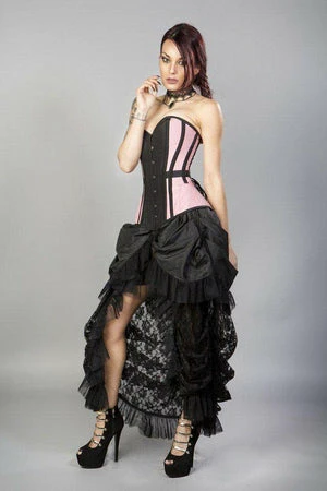 This Morgana long overbust burlesque corset in contrast color has black taffeta piping and waistband, clip fastening and back lace fastening with modesty panel.
