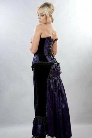 This Morgana long gothic victorian, satin skirt has black floral flock, black flock velvet panel with pockets, rear laced satin ribbon detail, a flattering fit and it fastens with a side zipper.