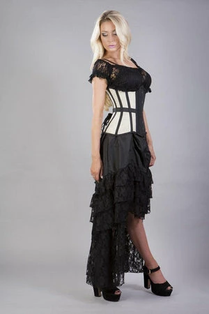 This Morgana underbust burlesque steel boned taffeta corset has clip fastening, laces and modesty panel at the back.