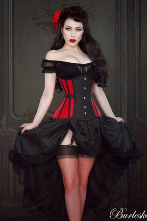 This sophisticated steampunk or gothic corset from Burleska, is ideal for a one of a kind head-turning peek-boo look! The design is available in black-red taffeta, black-brown taffeta, and black-cream taffeta.