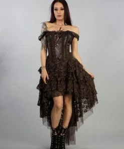 This Ophelie burlesque coffee brown matte corset dresshas brown lace detail, lace frills and ribbon detail, back lace fastening with modesty panel.