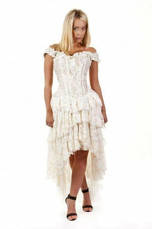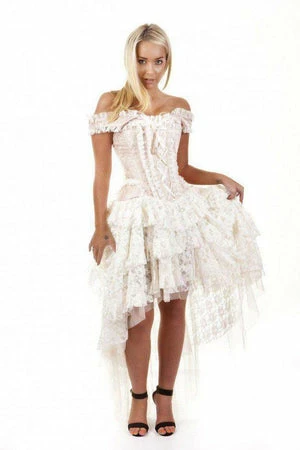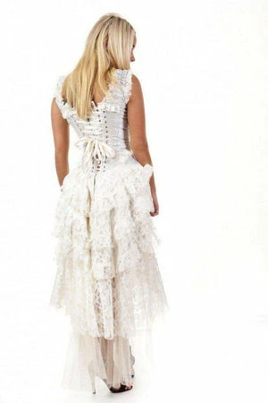 This maxi corset dress has king brocade, lace frills, ribbon detail and back lace fastening with modesty panel.