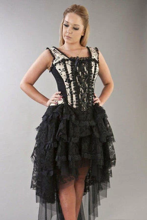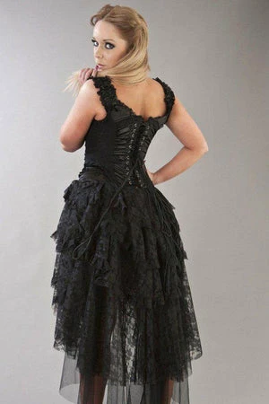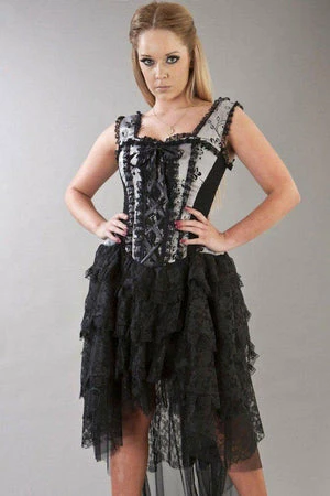 This satin, Victorian corset dress has black floral flock, lace frills, ribbon detail and back lace fastening with modesty panel.