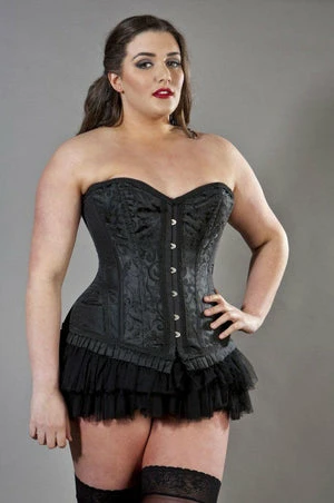 This Petra long line overbust waist training, steel boned scroll brocade corset has clip fastening, laces and modesty panel at the back.