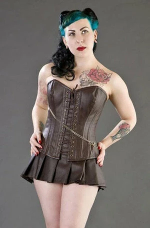 This glamorous steampunk or gothic corset from Burleska, is a necessary addition for an extra touch of vintage to your look. The design is available in black matte vinyl and brown matte vinyl.