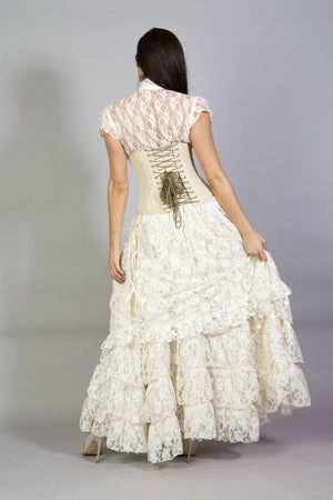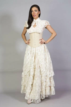 This Victorian long gothic cream skirt has cream lace overlay, layered frills, an elasticated waist and a flattering fit.