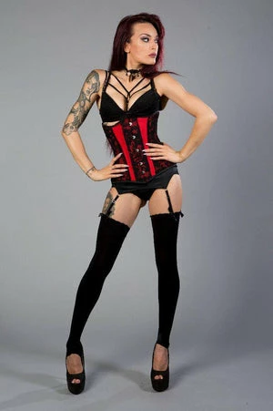 This Vivienne underbust steel boned taffeta burlesque corset has beautiful black lace motifs, clip fastening, laces and modesty panel at the back.