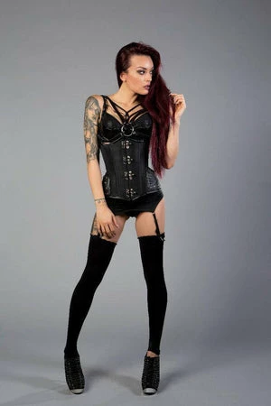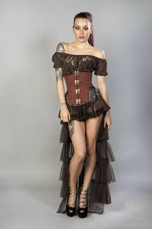 This Warrior underbust steel boned steampunk taffeta corset has matte hip panels, c-lock fastening, laces and modesty panel at the back.