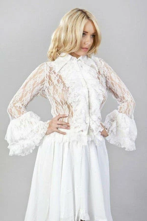 This Widow ladies vintage, white stretch lace shirt has frilled front and cuffs, laced satin ribbon detail at rear and a flattering fit.