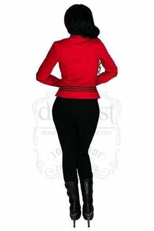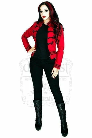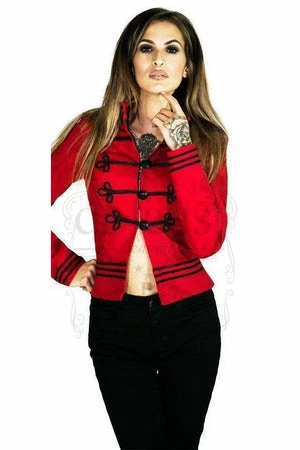 The military style, red short cotton jacket has black military swirl braid detailing and it fastens with large black buttons.