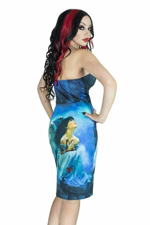The sleeveless stretchy, knee-high cut dress has an angel, night sky and blue moon print, a sweetheart neckline, and a figure accentuating shape.