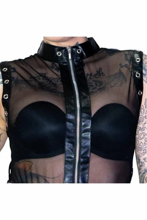 The sleeveless non-stretch sheer black mini dress has an eyelet trim, black belt, a high neckline, a figure accentuating shape and it fastens with a zipper at the front.