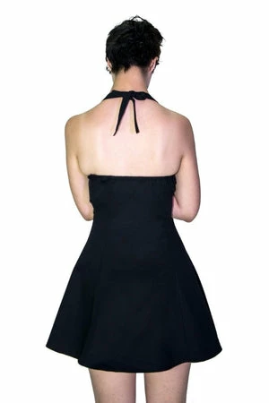 The sleeveless stretchy black mini dress has metallic silver eyelets detailing, halterneck tie, a sweetheart neckline and a figure accentuating shape.