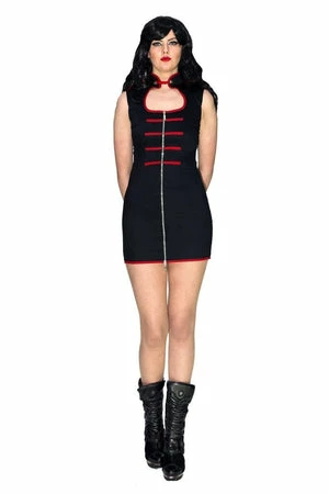 The sleeveless stretchy black bodycon dress has horizontal red stripes, epaulets and red pipping detail, a figure accentuating shape and it fastens with a zipper at the front.