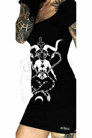 The black mini dress has sitting Baphomet print, a scoop neckline, short sleeves, black waist line and a figure accentuating shape.