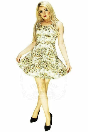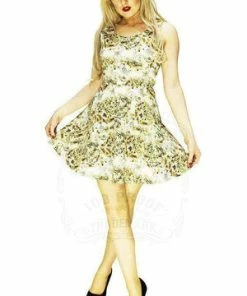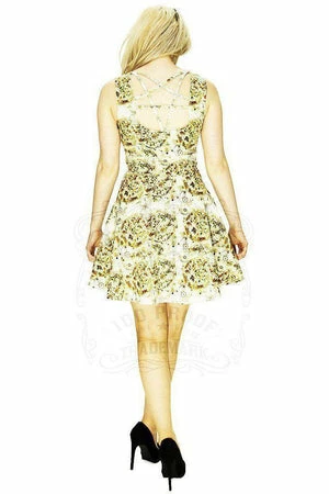 The sleeveless stretchy mini dress has zodiac signs print, back pentagram cut, a round neckline and a figure accentuating shape.