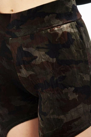 These military style leggings have a dark camouflage pattern, harness detail and a figure accentuating shape.