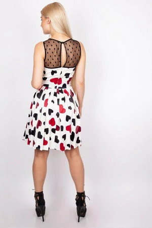 The sleeveless dress has an allover hearts print, patterned mesh neckline, a sweetheart neckline, pleated skirt, a flattering fit, back keyhole cutout with a button and it fastens with a hidden zip at the back.