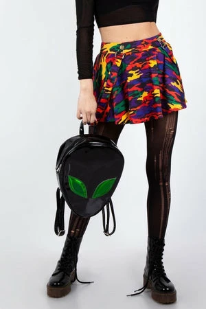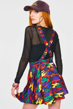 This mini skirt has a multicolored camo print, two side pockets, a relaxed fit, an adjustable belt with snap button closure and it fastens with a zipper at the back.