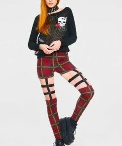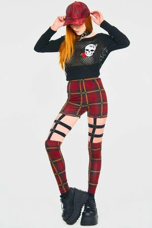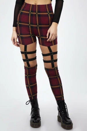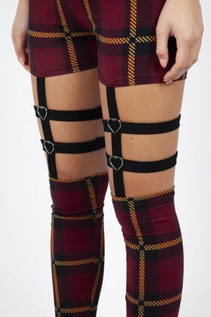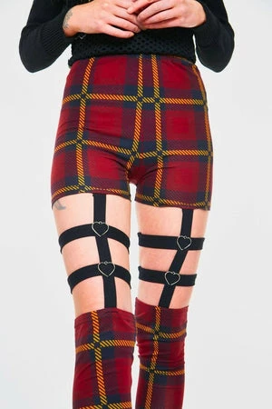 These leggings have a plaid print, harness feature, an elasticated waistband, heart ring detailing and a figure accentuating shape.