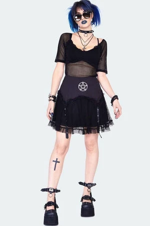 The mini high waisted skirt has Pentagram embroidered design, net overlay, suspender belt detail, ruffle hem mesh layer detail and a flattering fit.