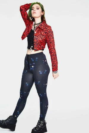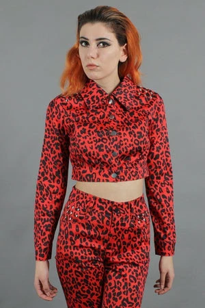 This biker cropped jacket has red leopard print, studs detailing, long sleeves, a high neckline with collars, ribbed cuffs and it fastens with buttons at the front.