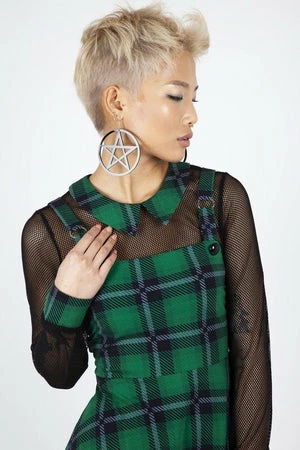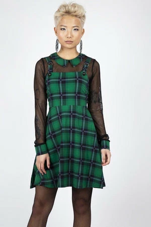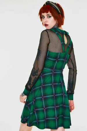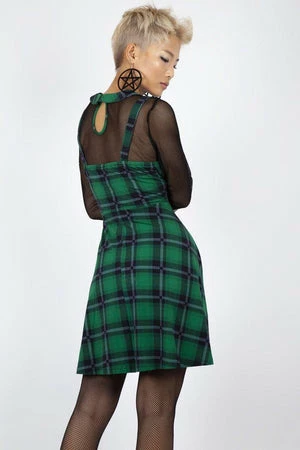The pinafore style mini dress has green plaid print, a square neckline, full length mesh sleeves, button and o-ring detailing and a flattering fit.