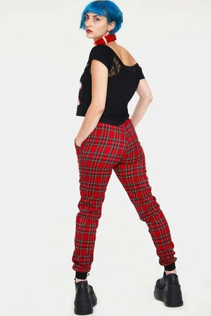 These tartan trousers have skeleton legs print, drawstring waist, ribbed hem and waist, pockets, slim leg and a figure accentuating shape.