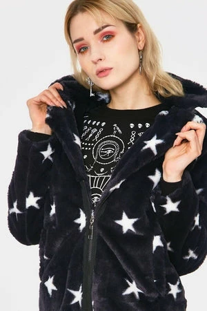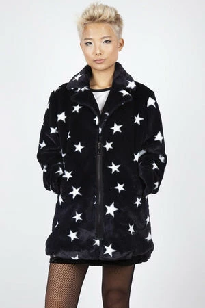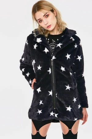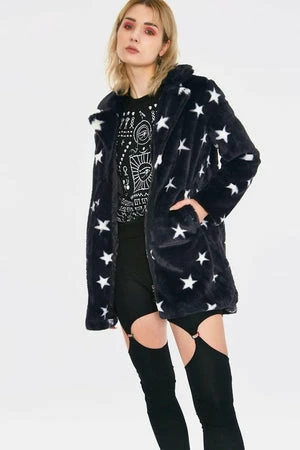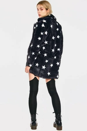This faux fur coat has stars design, long sleeves, a V-neckline with collars and it fastens with a zipper at the front.