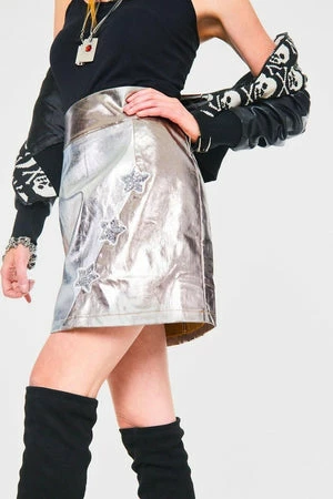 This silver mini pencil skirt has star detailing, high waist, a flattering fit and it fastens with a zipper at the back.