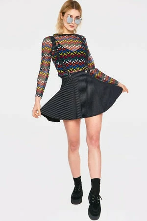 This A-line mini pin striped skirt has detachable suspenders detailing and a flattering fit.