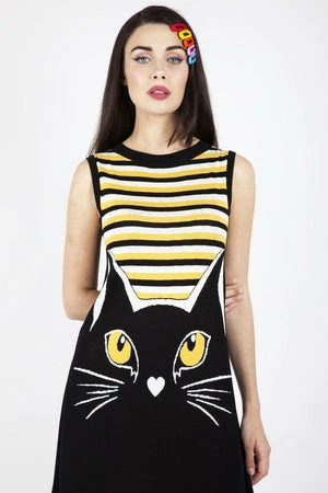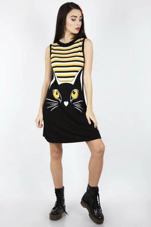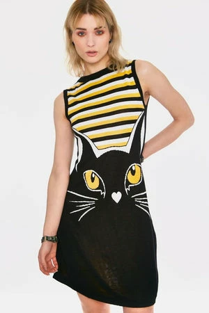 The jumper style dress has a front cat and stripes design, a round neckline and a flattering fit.