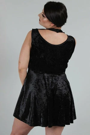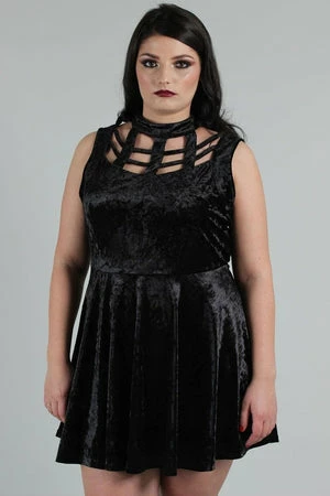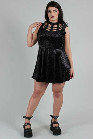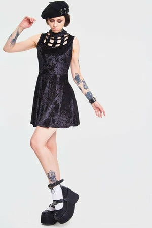 The sleeveless skater mini dress has a caged neckline, a figure accentuating shape and it fastens with a button at the back.